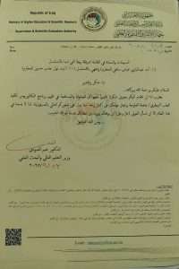 Assistant Professor Dr. Raed Abdul Mahdi Qasim a lecturer at the Faculty of Veterinary Medicine at the University of Kerbala received a letter of thanks and appreciation from His Excellency the Minister of Higher Education and Scientific Research in recognition of his outstanding scientific efforts and fruitful academic contributions particularly his active contribution to the evaluation of the bachelor’s programme at the Faculty of Veterinary Medicine at the University of Fallujah and his efficient and sincere performance of the tasks assigned to him.