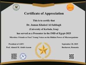 Assistant Professor Dr. Juman Khalil Ibrahim a faculty member at the College of Veterinary Medicine at the University of Kerbala participated in the events of World Microbiology Day (IMD 2025) organised by the Arab Republic of Egypt in its current session with the participation of a group of researchers and academics from various countries around the world under the auspices of the Arab Society for the Conservation of Fungi.